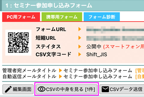 「CSVの中身を見る[0件]」と表示されている場合は、CSVデータが0件なので、表示するデータが無く見る事ができません。テスト送信などを行なって頂き、1件以上CSVデータを溜めた状態にしてから「csvの中身を見る」ボタンを押してください。