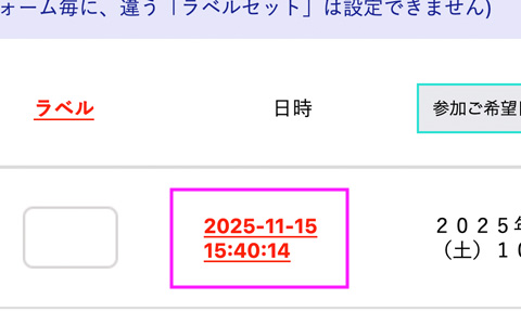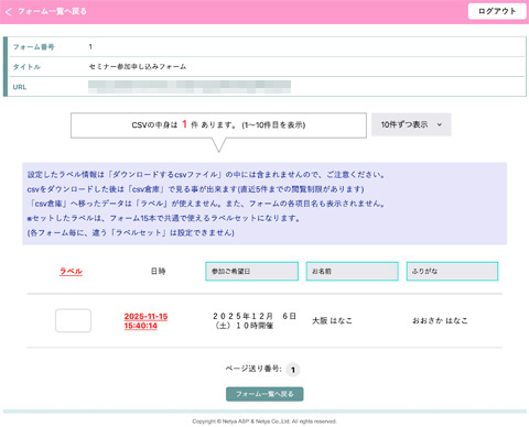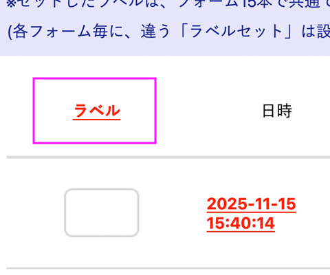 また「ダウンロードできるcsv」には、ラベル情報は含まれていません。メールフォームの内容を変更したり、一度「溜まったcsvを自動排出」してしまった後は、「csv倉庫」へデータが移りますが、「csv倉庫」の方には、「ラベル機能で設定したラベル情報」は一緒にデータ移行しませんので、ご注意ください。