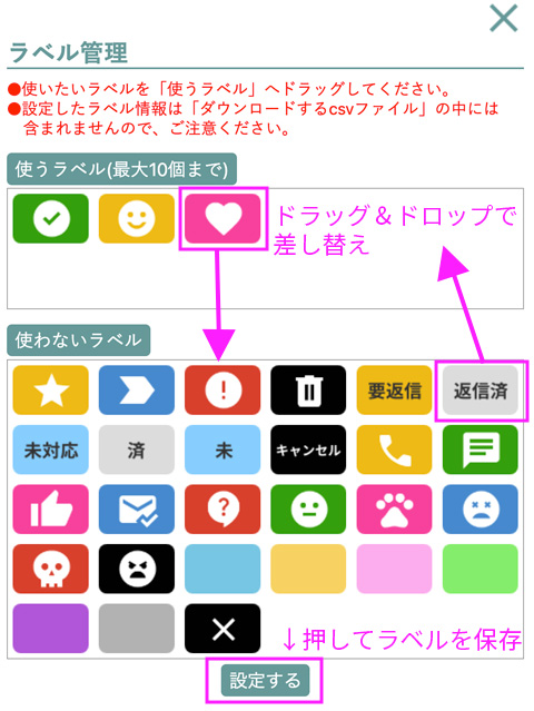使いたいラベルが整理できたら、画面の下側にあります「設定する」ボタンを押して、ラベルの保存をしてください。