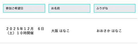 たとえば「出欠の確認だけ一覧で見ておきたい」場合には、「お名前」と「出欠」だけを、表示の優先項目として表示させて使う事もできます。