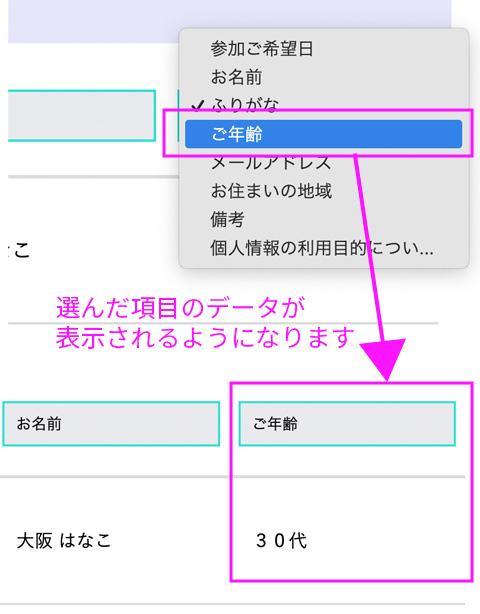 プルダウンメニューをクリックすると、「フォームの項目名」が表示されるので、表示したい項目を選べば、「送信内容の中身全部」を確認する事なく、素早く、見たい情報だけを見る事ができます。